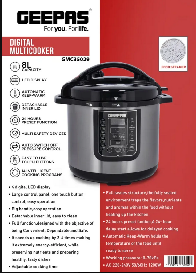 زودپز برقی جی پاس Geepas با توان 1200 وات امکان پخت انواع غذاها را در سریع ترین زمان ممکن فراهم می کند. جنس بدنه زودپز استیل ضد زنگ بوده که علاوه بر این که بر زیبایی ظاهری دستگاه افزوده است بسیار مقاوم و محکم می باشد و هم چنین به راحتی قابل تمیز شدن می باشد. ظرفیت8 لیتری زودپر مناسب برای تهیه غذا برای 7 تا 10 نفر می باشد.